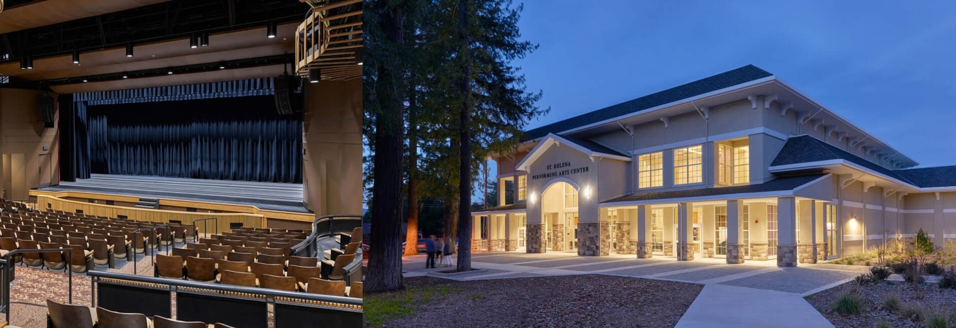 This performance venue, designed by Hibser Yamauchi Architects, includes a 350-seat theater, a drama classroom that doubles for the "Green Room" for all performances, a band room, scene shop, restrooms, box office and lobby/gathering space. The facility includes state-of-the-art lighting, sound and acoustical systems. The design of the exterior of the building pays careful attention to the existing historic character of Vintage Hall, an adjacent building on the campus.