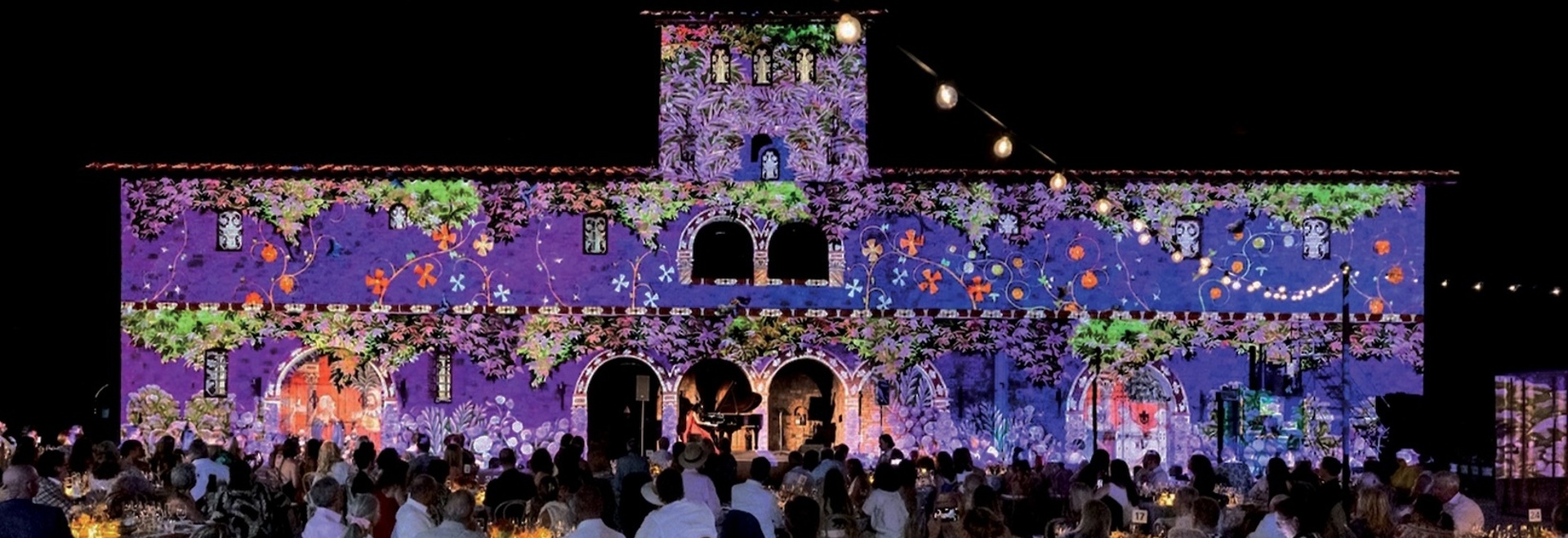 Guests are welcomed onto the Castello's open-air crush pad where they will enjoy a seasonal dinner paired with estate wines from Castello di Amorosa's cellars, amid sweeping sunset views across the Diamond Mountain region. As evening falls, the setting will come alive with an experience of sight, sound, and movement — an evening of artistry and wonder, and a touch of the unexpected.